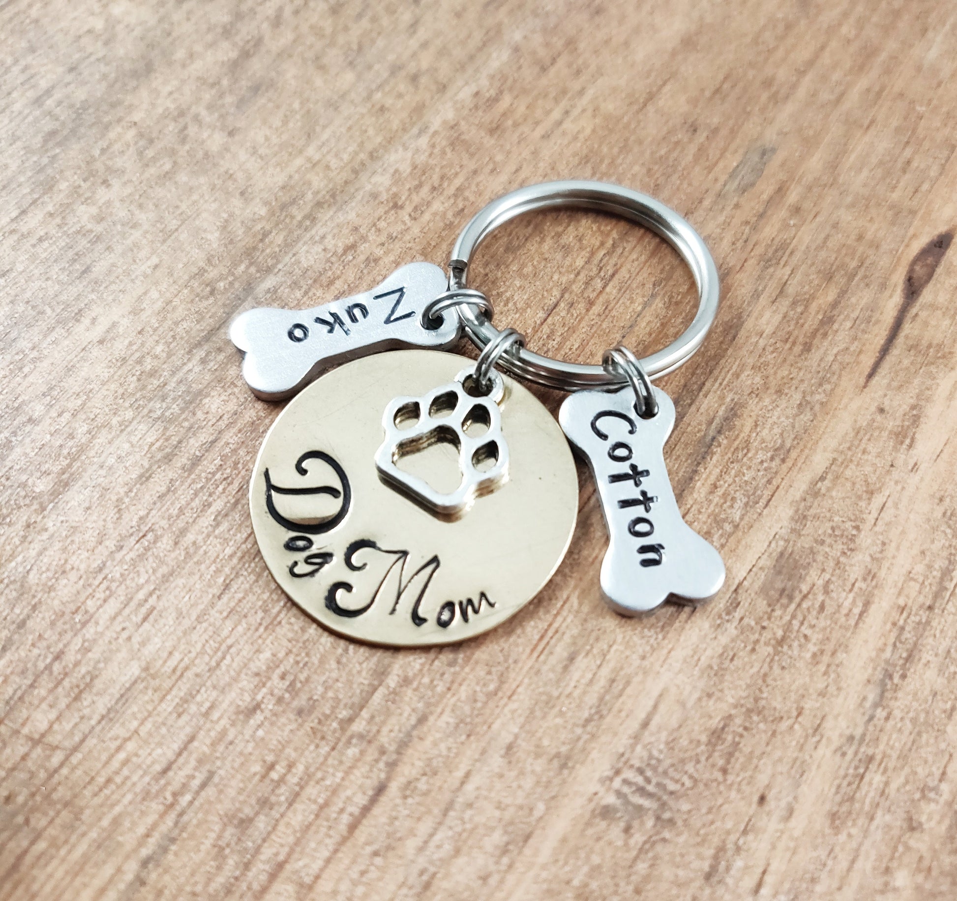 Hand stamped with the words Dog Mom on a brass 7/8 inch disc, and adorned with Dog Bones stamped with the names of your pup's! Perfect gift for any dog mom!