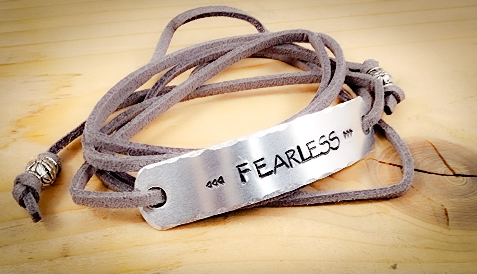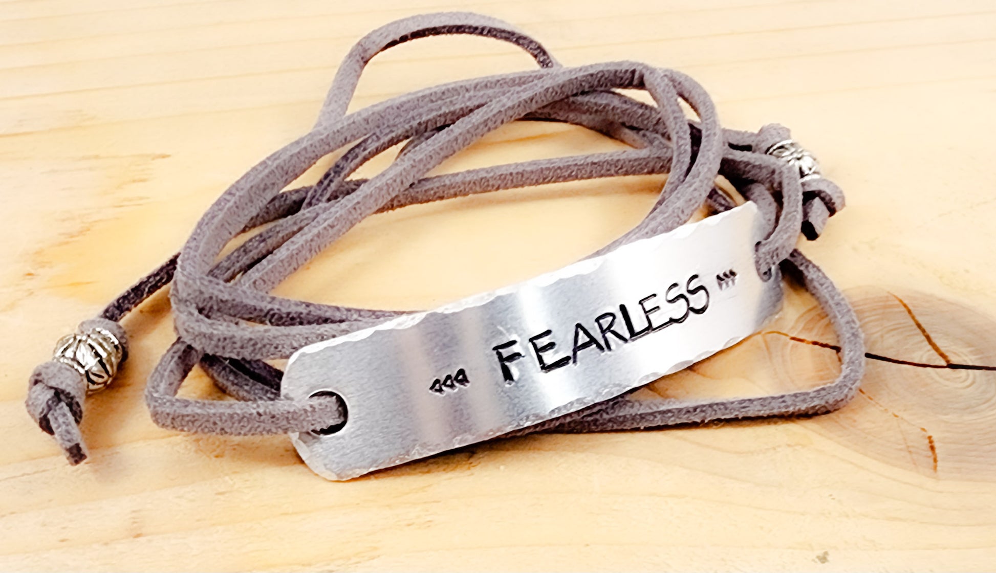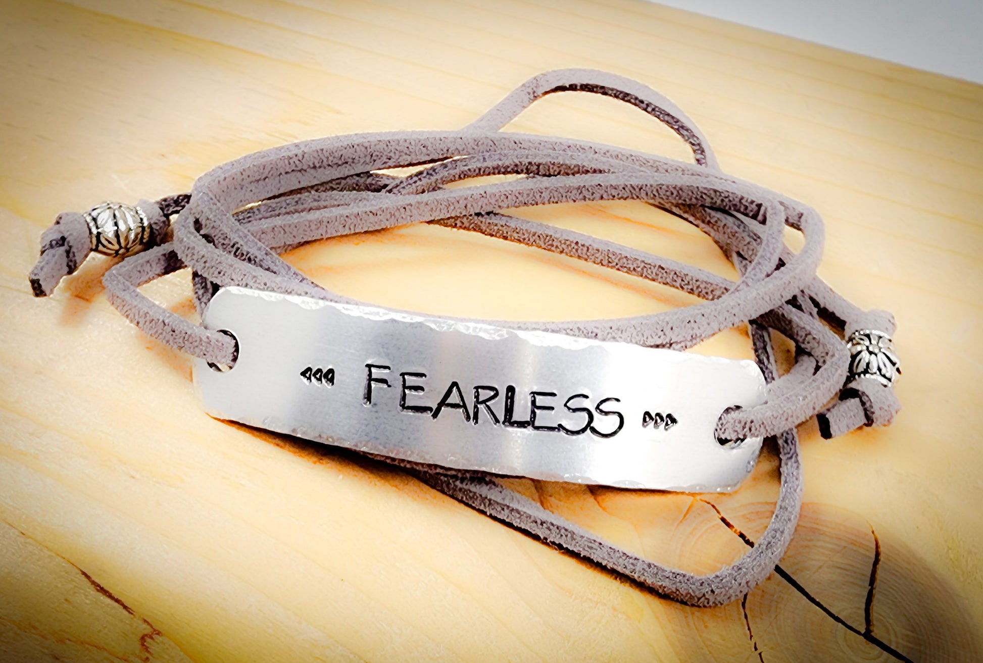 This particular Bracelet Wrap is hand stamped with the phrase "Fearless".