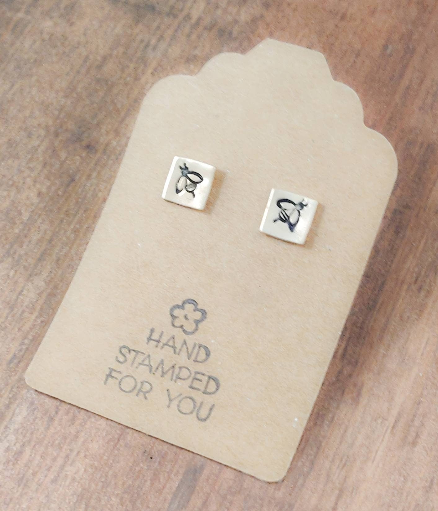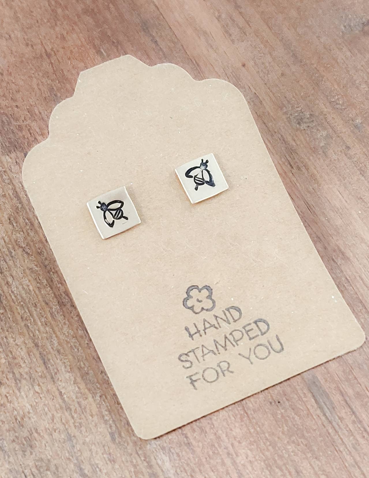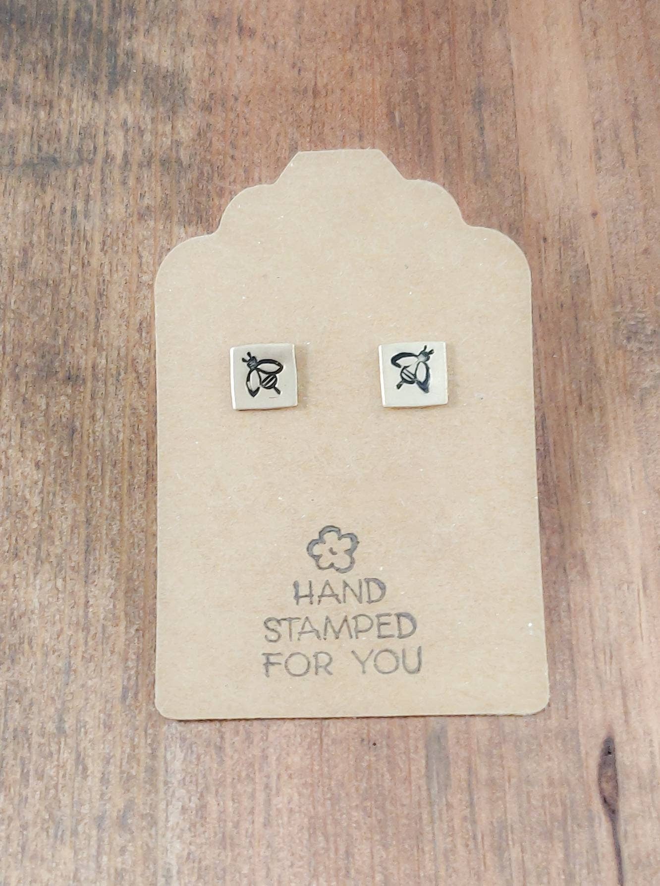 Small Gold Earrings adorned with cute hand stamped Bees. Push back closures on back.