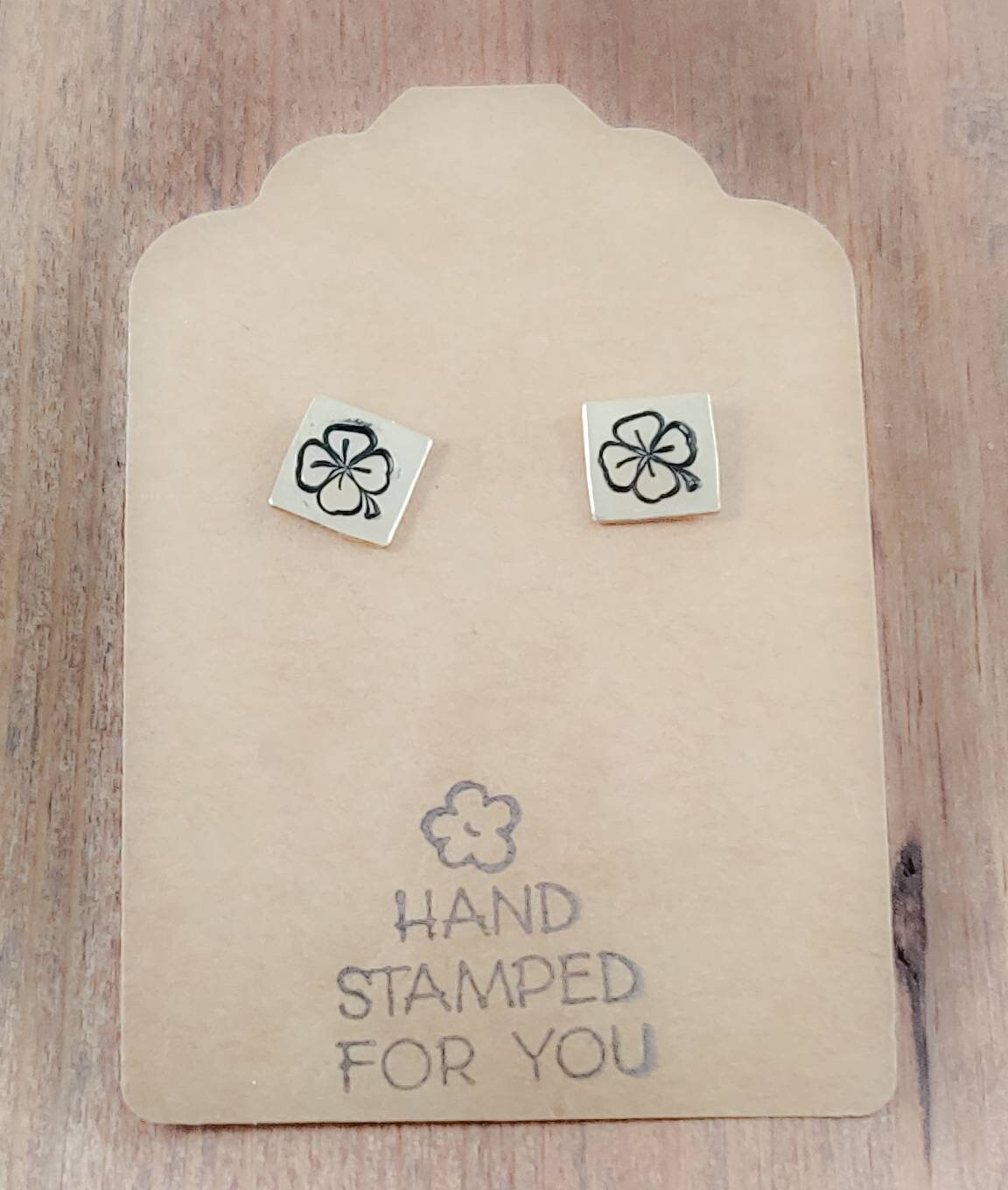 Gold Stud Earrings, Four Leaf Clover Earrings, Small Earrings, Dainty Earrings, Hand Stamped Earrings, Four Leaf Clover Jewelry