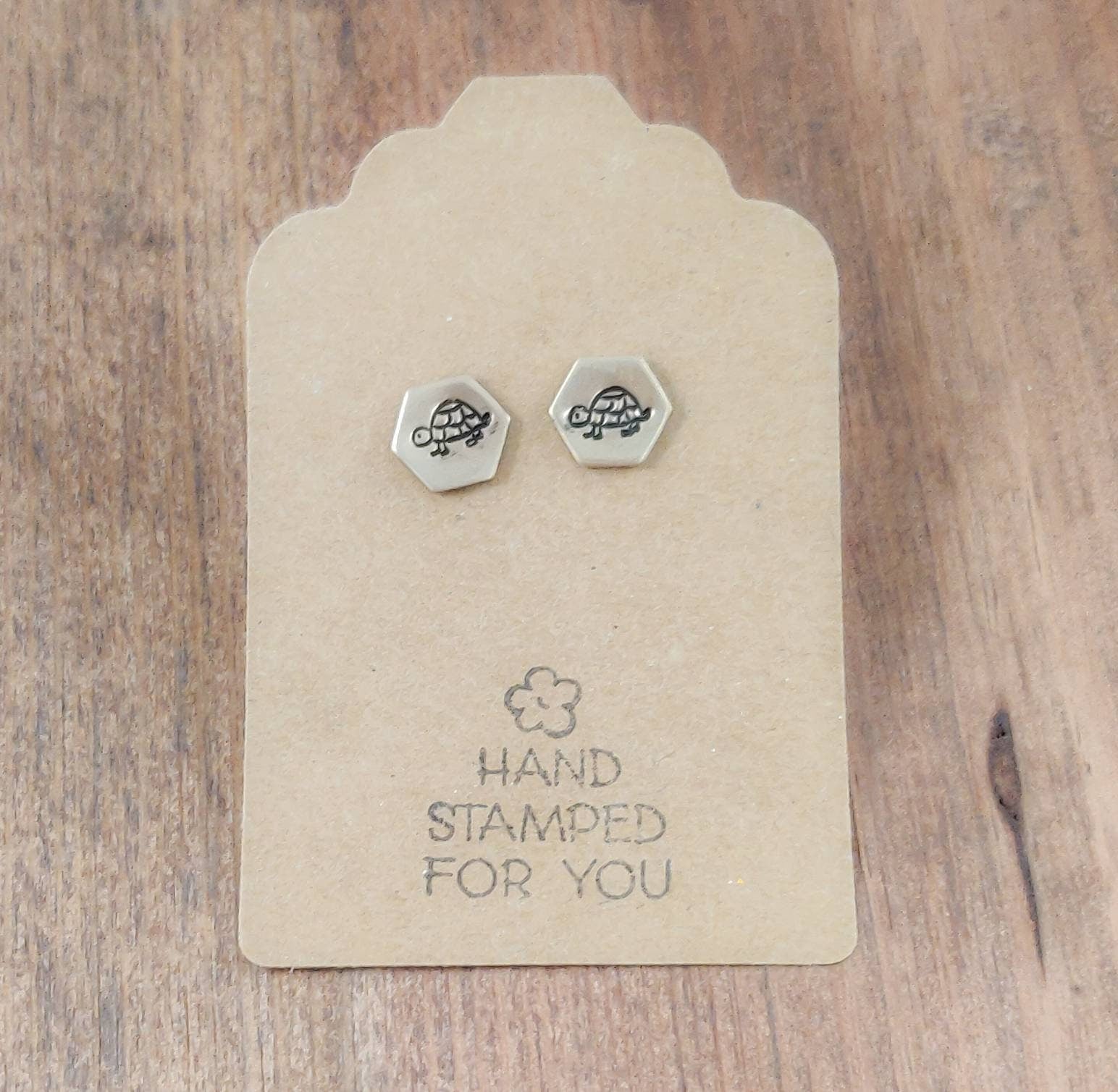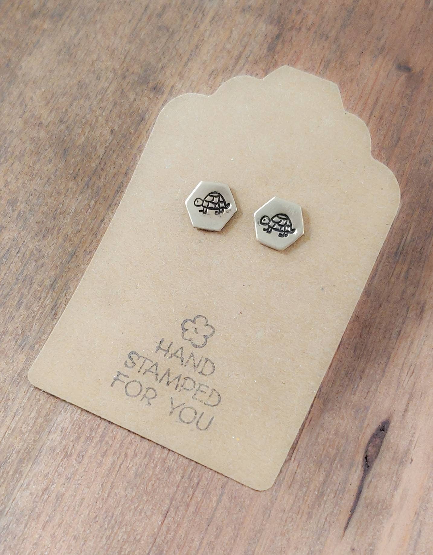 Small Gold Earrings adorned with cute hand stamped Turtles. Push back closures on back.