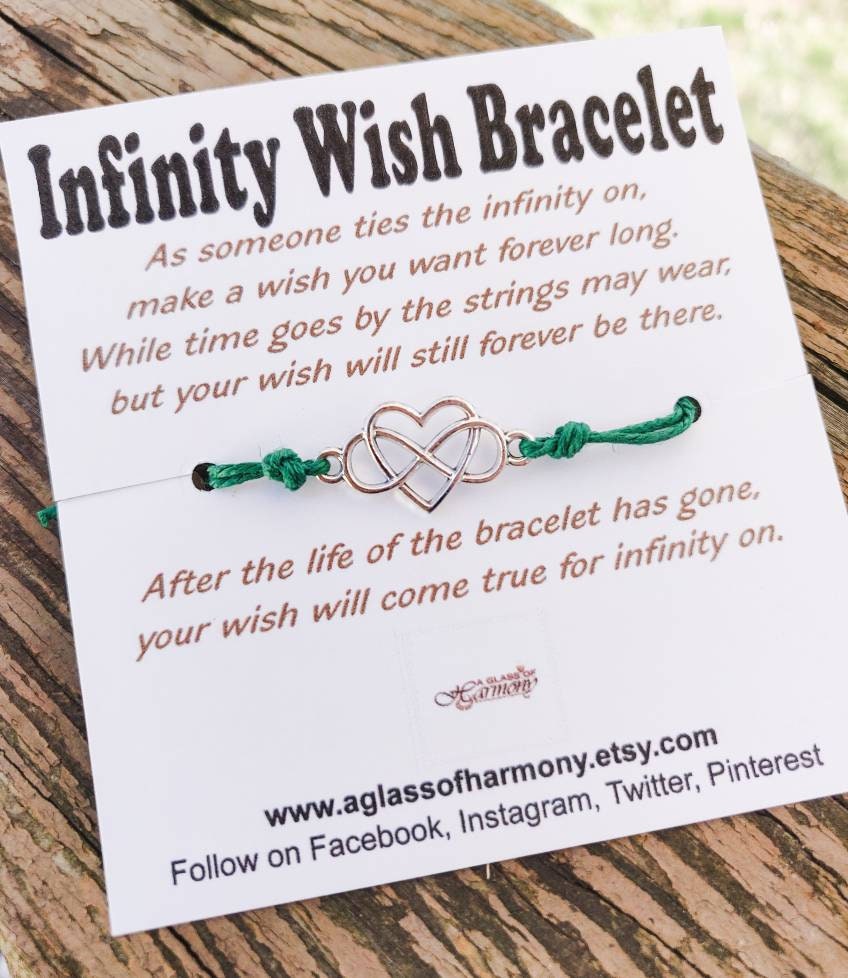 This Wish Bracelet comes with a dark green cord, infinity heart charm, and the attached poem that reads:
