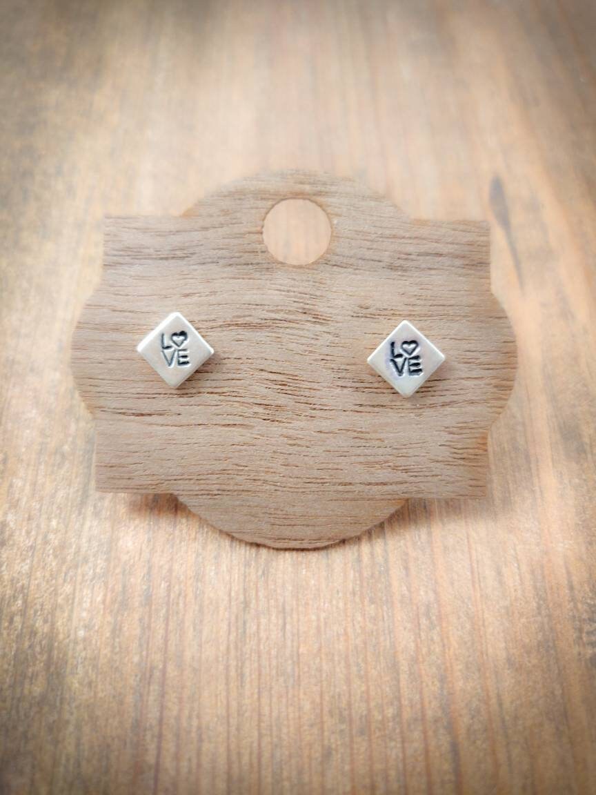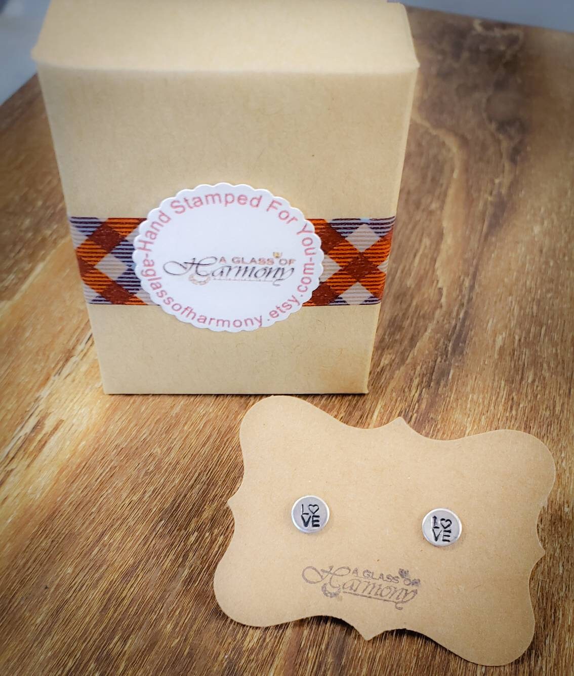 These cute silver hand stamped earrings are stamped with with a cute variation of love. Perfect for Valentine's Day.