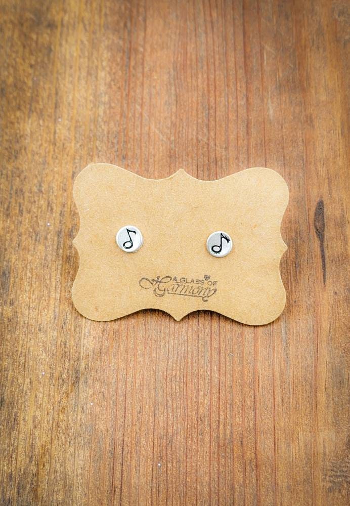 Small Silver Earrings adorned with cute hand stamped music notes. Push back closures on back.